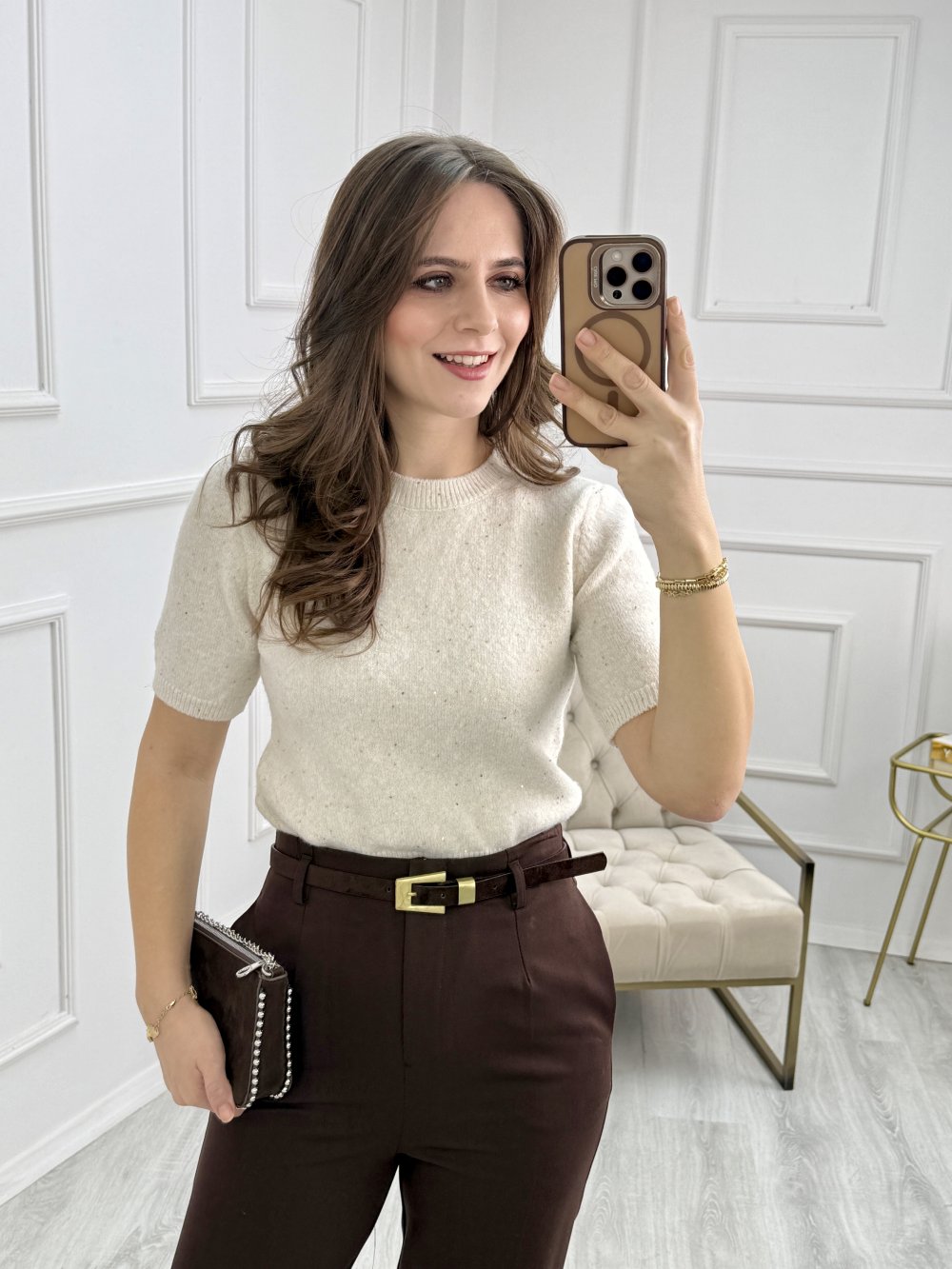 Bisiklet Yaka Pullu Simli Triko Kazak Krem