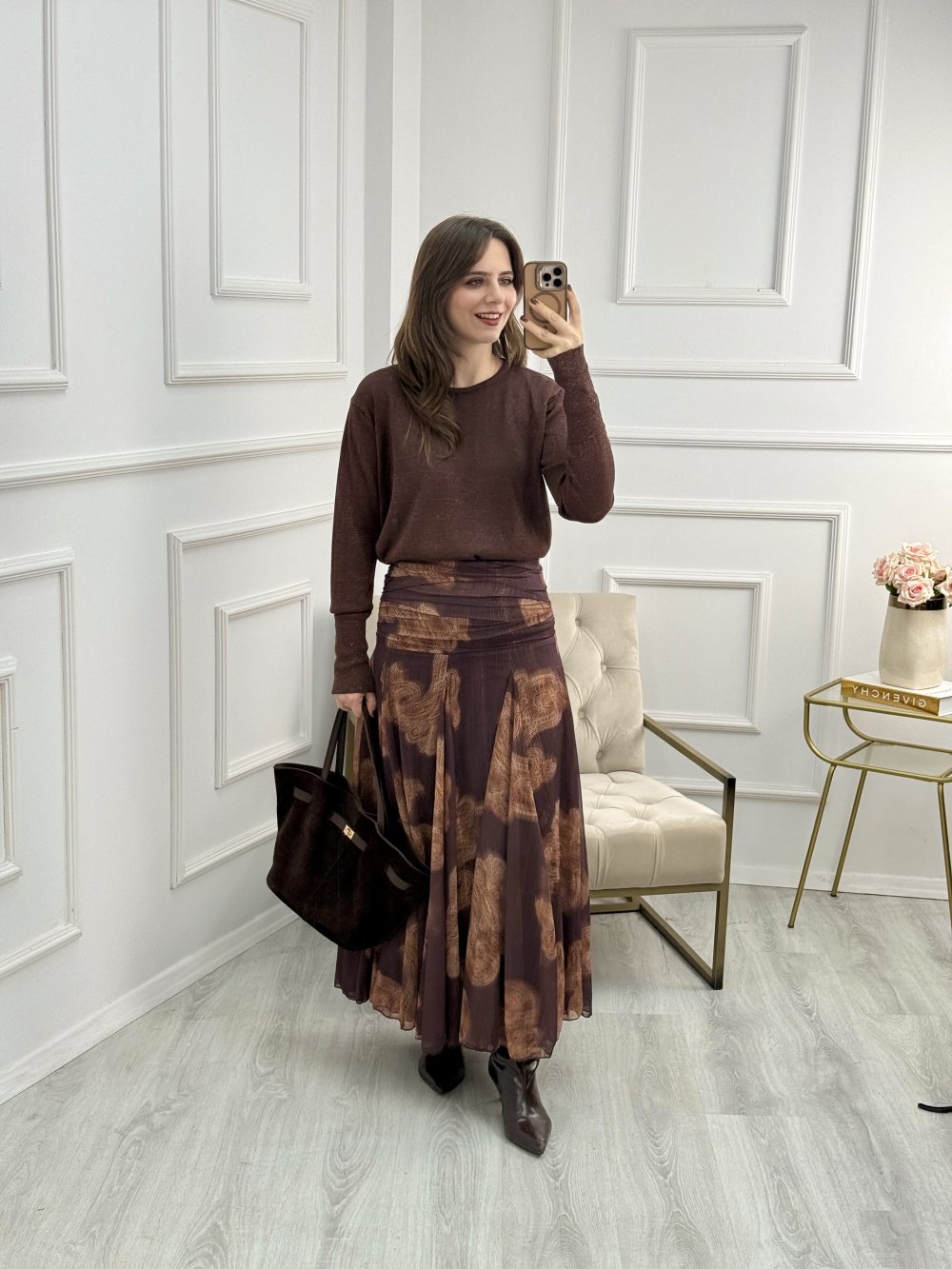 Desenli Astarlı Şifon Etek Kahverengi