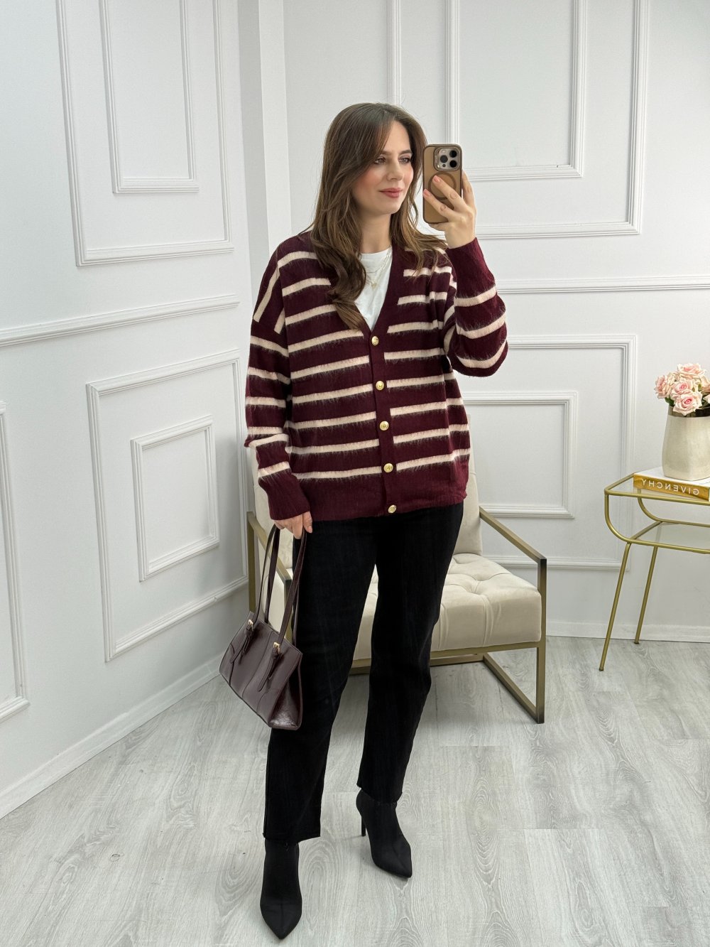 Massi Model Çizgili Hırka Bordo Bej